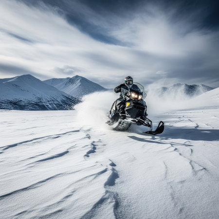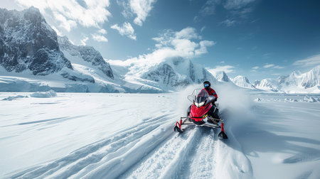 A thrilling scene of a rider expertly maneuvering a snowmobile through a stunning white snowy landscape with majestic mountains in the background, capturing the essence of winter adventure.