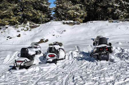 three snowmobiles stand on a slope covered with snow snowmobile in winter mountain