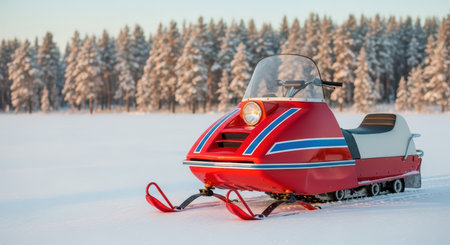 Vintage red snowmobile on snowy forest landscape during sunrise
