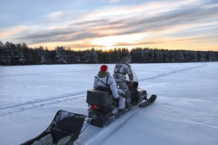 Group of friends on a snowmobile moving in the winter forest at sunset.