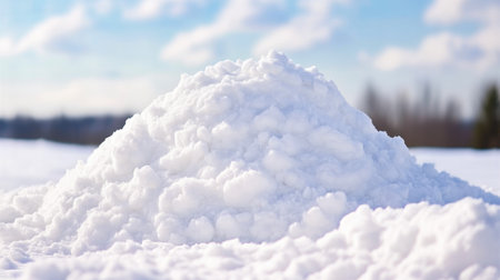 Large snow pile, realistic style, on snowy background. Concept of winter storage. A huge snowdrift. Dangerous driving on the roads. Clearing roads of snow. Snowfall on the roads