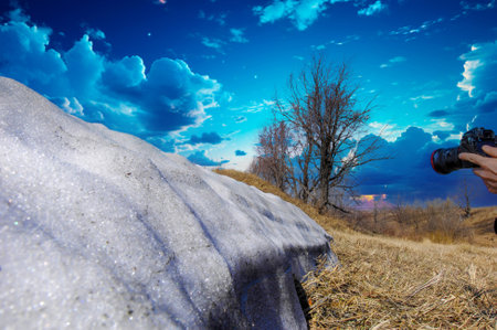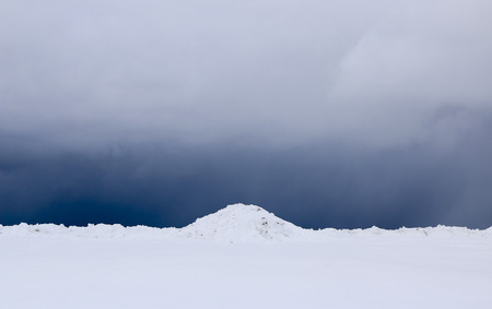 snow field. plain covered with white snow under blue sky with thick white clouds. before snowfall, storm, snowstorm. premonition of blizzard. in anticipation of blizzard.