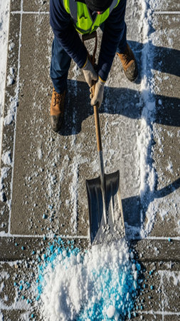 A high-angle, vertical editorial photograph showing a construction worker shoveling ice and spreadin