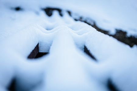 Wooden surface blanketed in snow, displaying unique patterns and textures, creating a tranquil winter scene that evokes a sense of calm and beauty