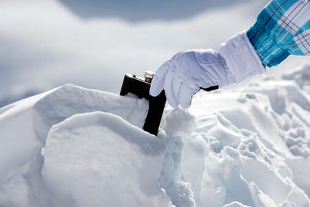 A detailed, editorial close-up photograph capturing the necessary action of winter maintenance: hand