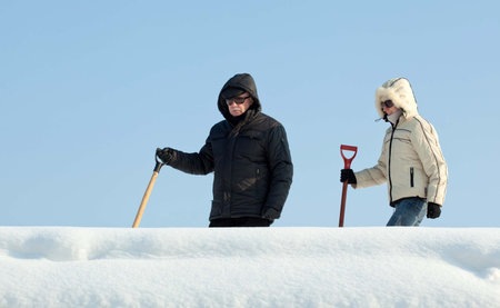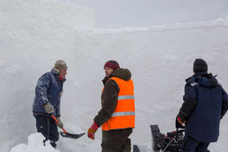 PETROPAVLOVSK CITY, KAMCHATKA PENINSULA, RUSSIA - DEC 27, 2017: Workers with snow shovels carry out winter cleaning of roof of building from snow and ice after heavy snow cyclone (snowstorm, blizzard)