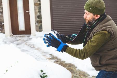 Winter fun. A man with a beard in a warm waistcoat and hat forms snowballs in the courtyard of a private house in a frosty day