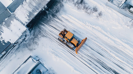 Aerial view of a snow removal vehicle clearing a snowy landscape during winter. This heavy machinery efficiently tackles snow accumulation in urban areas.