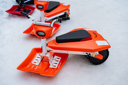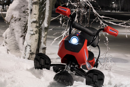 Red children's sled snowmobile, snow scooter. Children's winter transport close-up against the background of the evening landscape