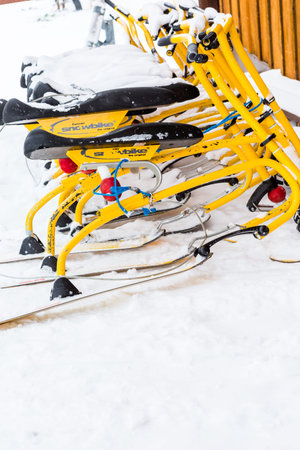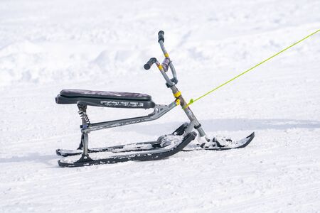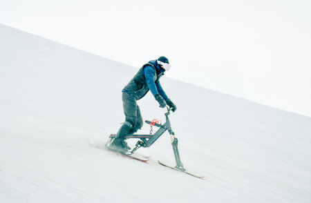 Male athlete riding ski bike on snowy slope during winter sports activity, concept of adventure tourism, innovation and extreme fun in freezing cold snowy extreme conditions