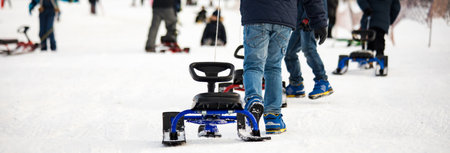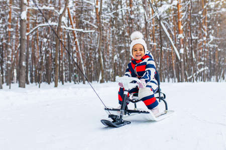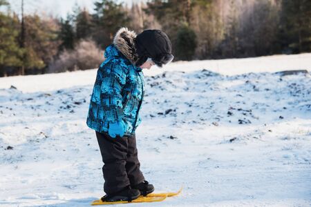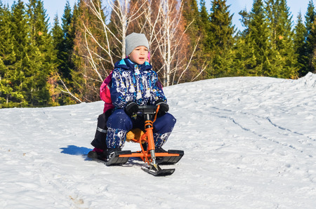 Little 3 years old boy sliding on the sledge scooter on winter day