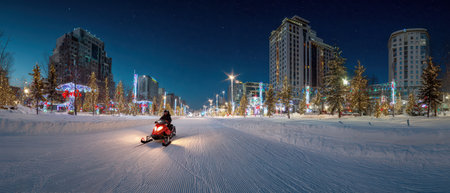 Snowmobiles glide through a vibrant urban landscape adorned with sparkling lights celebrating the joy of New Year