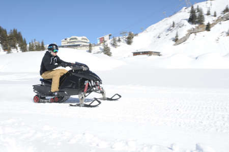 Snowmobile. Snowmobile races in snow. Concept team of friends chasing mountains.