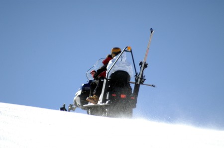 Service Snowmobile at Zillertal Arena ski resort in Tyrol in Mayrhofen in Austria in winter Alps. Snow mobile at Alpine mountains with white snow and blue sky. Downhill fun at Austrian snowy slopes.