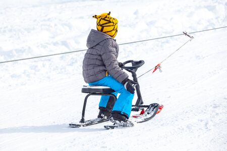 Back view of child in pulling sledge and running up snowy slope while spending time on ski resort
