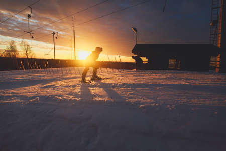 Kids with sledge climbing at the snowy hill on winter park in Bakuriani, Georgia