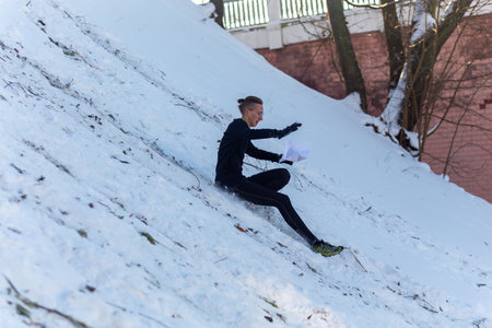 Shot of person during falling in snowy winter park. Woman slip on the icy path, fell and lies. Danger of season trauma.