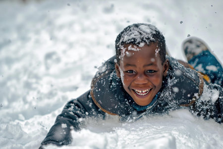 Adventurous African boy sliding on snow in warm clothes. Little child enjoying frost outdoor wintertime. Generate ai