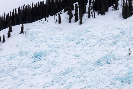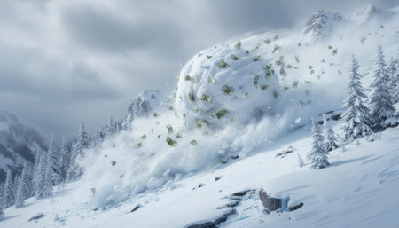 Avalanche sliding through frozen wilderness in harsh winter conditions.