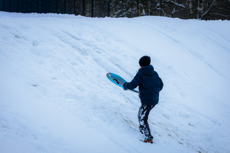 Child in dark jacket climbs snowy slope with blue sled in hand, ready for fun winter activity, surrounded by a serene snowy environment