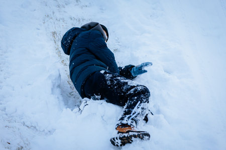 A man slips on ice and falls face down in snow on a winter street, highlighting injury risks