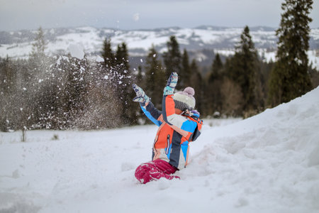 happy kids tubing down snow slide in winter. cheerful childrens active sports winter recreation. ice mountain skiing