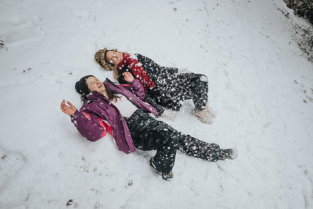 Two friends enjoying the snowfall while lying in the snow in winter outdoors