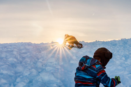 Two Children Playing in Snow with Sunlight in Winter. Rochers-de-Naye, Vaud, Switzerland.
