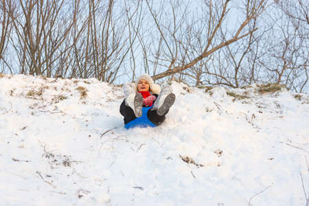 e happy child in the winter. Winter scene. Time of winter vacation. School break. The cheerful beautiful girl goes down from an ice slope. Cheerful happy child in the winter.