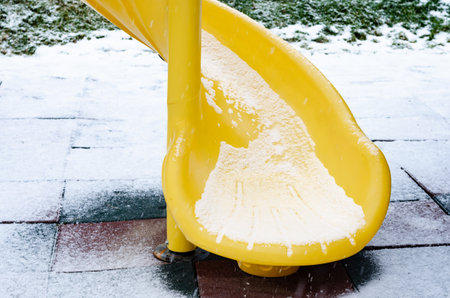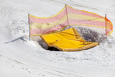 earthen pit covered with a yellow mat fenced with a net on a snowy slope, Safety and Active recreation with the family