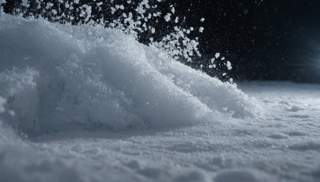 Photography captures snow particles frozen midair, beautifully lit by cold backlight, enhancing the tranquil winter scene with soft textures and atmospheric depth