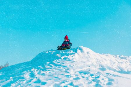 happy boy sliding down snow hill on sled outdoors in winter, sledging and season concept
