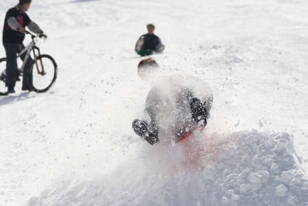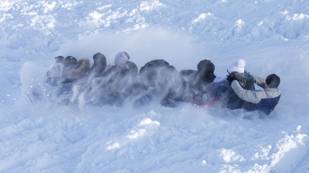 Children slide on snow in old school style with hardwood sled in Istanbul.Happiness and joy concept.Istanbul,Turkey.31 December,2015