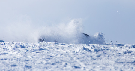 Unrecognizable person jumping into the snow, snowdrift, winter pleasure, joy, winter holidays. Top view