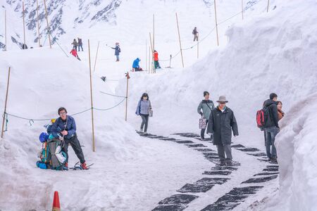 Tateyama, Japan - April 21, 2019 : Unidentified tourists visiting snow corridor on Tateyama Kurobe Alpine Route, Japanese Alp in Tateyama, Japan.