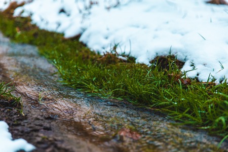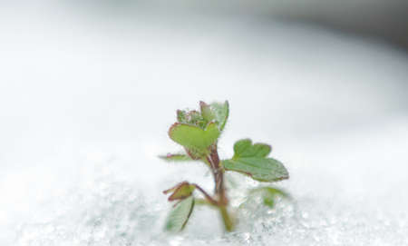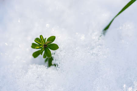 Green grass grows through the snow. Unexpected snowfall in the spring. the concept of life, awakening, inspiration. Warm spring rays sparkle on the texture of the snow. Abstract natural background.