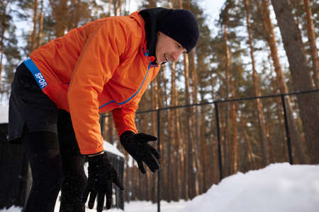 Portrait of a man stretching in the park on a beautiful snowy winter day