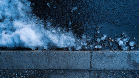 Close-up of melting ice chunks on dark asphalt road with concrete curb