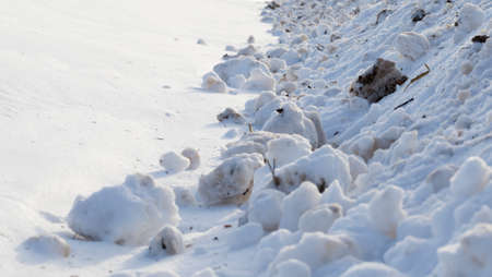 Close-up view of snow covering fractured ice, showcasing winter's serene beauty. Cold, peaceful scene.