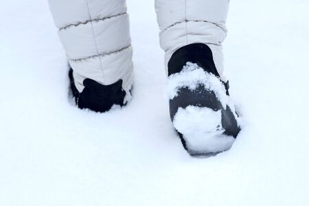 A person is walking on a slippery road, the first snow in the park, winter shoes, the road is covered with slippery ice and white snow. Footprints and shoes close-up.