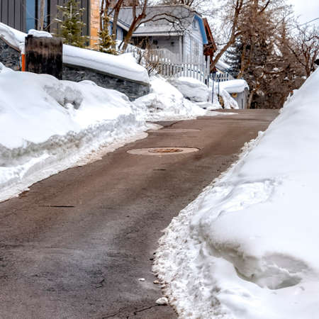 Square frame Residential landscape with paved road along mounds of snow and houses in winter