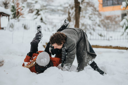 Two friends playing together joyfully in the snow during wintertime outdoors