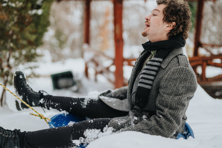 Child dressed in warm winter attire falls on snow-covered hill while sledding, surrounded by a serene winter landscape, capturing the essence of playful outdoor adventures