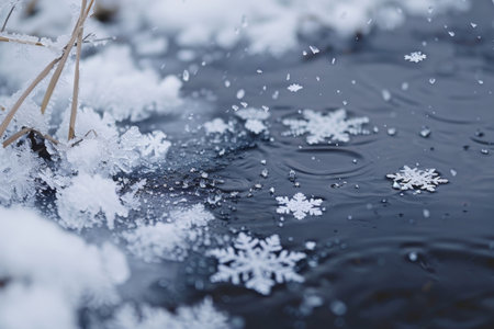 Snowflakes delicately fall onto a frozen pond, creating a serene winter scene, Delicate snowflakes falling gently on a frozen pond