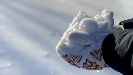hands holding a pile of white sparkling snow, wearing white knitted mittens, banner. sun shining, highlighted bright heap, sunny winter day, snowy background with light beams, ice crystals, snowflakes