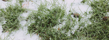 moody green grass growing through the snow on a field in winter with autumn leaves banner photo, low angle view, copy space, hello spring, goodbye winter concept