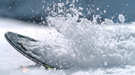 Detail of a ski with snow flying in the air , sunny day on the mountains