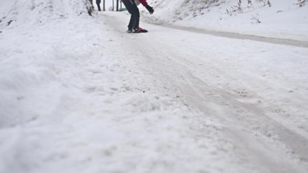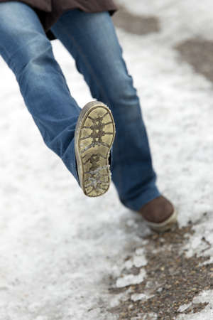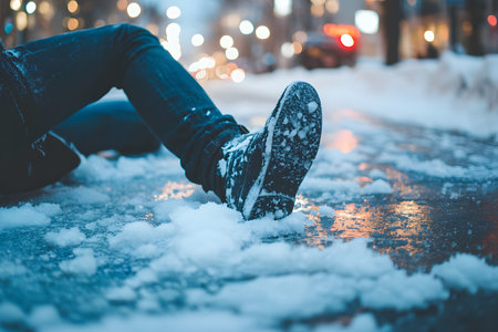Close up of feet after a fall on icy street in urban winter setting, capturing cold weather action