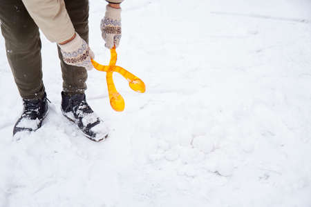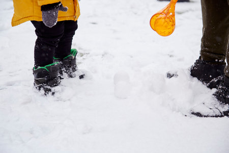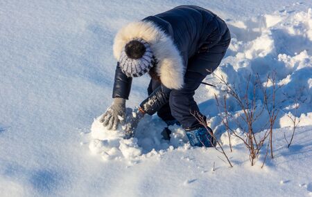 Father makes snowballs in the city yard. Spending time together. copyspace. high quality photo