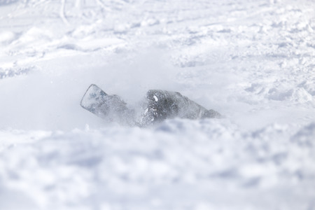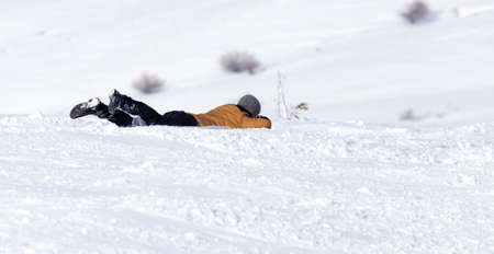 A man falls in the snow. The man slipped and was injured. Falling on slippery ice. Winter. Fracture, bruise, dislocation.